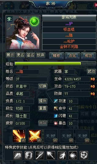 晕,用上面我回复的火隐过七杀就行,学个不死,又不用提资质,专七杀用。不死护我们区三四个玩家都放弃了。现在家将精修后还是普通铁甲护牛