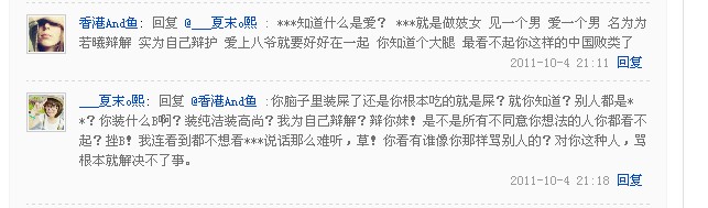 香港And鱼,你是不是有病啊?你要说若溪不好别人就不能说她好?说她好就是被人**过N次?!你看看你说的是不是人话?当然不是~因为你根本就不是人!我是实在没办法忍受才发的这个帖子,就想发泄一下,虽然我知道被狗咬了不能回头咬狗,但是我实在受不了!吧主看到了就删吧,我纯粹发泄!下面就是事情的经过!个人的观点归个人的观点,香港And鱼,跟你这种人从没文明一说,因为你不配!狗!对!骂的就是你!!!