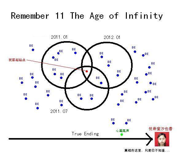 现在要来讨论最最令人头痛的第三作Remember11了。经过了时间轴的扭曲,R11的轮回方式与N7和E17又是大相径庭的。为什么要叫Remember?Remember的意思为回忆,想起,回想。其实Remember11的最大精髓,是游戏中的人物活活困死了游戏玩家,从而达到他们完美结局的目的。我们在游戏中经历过的悲欢离合,生生死死,说到底仅仅是“回忆”而已。因为真实的世界早已经无法被我们所观察到,所有的第四维的视点Self,已经成为了优希堂手里的玩物。