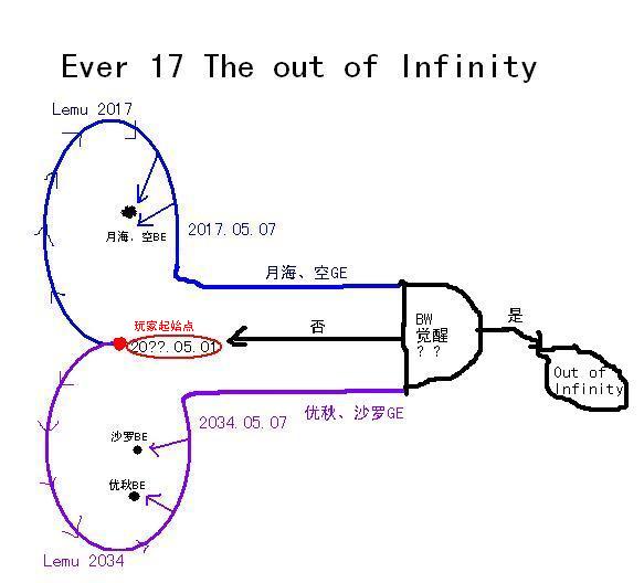 Ever17的副标题是“The Out of Infinity”, 意为“无限轮回的脱出”。从这张图里可以看出,E17的轮回和N7的轮回有很大的不同。 N7有点像是在一个圆形跑道内自己寻找出口,而E17则是像通过呼叫直升机帮助灾民带离危险地带。在E17中和N7中不同的是,每一个GE,都不是真正的GE。而是BW所获得的具体信息。E17中真正的团圆结局是BW觉醒后,大家在船上向BW招手的那一幕。因此在BW觉醒前,就算武哥的好结局再怎么不像好结局,少年的好结局再怎么甜蜜,都仅仅是充满着信息的动画片而已。对于真实世界而言,优春和桑古木可能仅仅是庆贺这些好结局是为他们计划前进了一步而已。而这个计划至少前进4步后(4个GE),BW才有可能获得最终觉醒的资格,才有可能去拯救大家,从而了解真相。