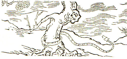 烛龙:西北海之外,有章尾山,有神,人面蛇身而赤,直目正乘,其瞑乃晦,其视乃明,不食不寝不息,风雨是谒,是烛九阴,是谓烛龙