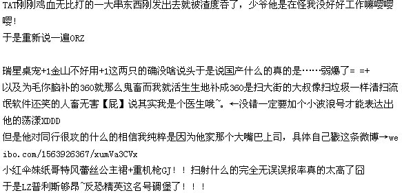 好像大家一提到这娃就是【卡吧!死机!】这种印象,但是作为他的老用户我对他感情还是挺深的哟TVT其实只要电脑配置过关的话用起来还行。。。不过他一旦开始工作(扫描或者杀毒)确实会卡= =|||我应该说不愧是小熊家的孩子吗,和他一样是个骨太=V=(病毒库太大运行起来自然相当占内存)即使有这个毛病我还是一直死忠他的原因除了经常换杀软对系统不好以外,最重要的还是他的杀毒能力相当BH——基本上可以称得上所到之处寸草不生。用一位同为杀软发烧友的哥们(这哥们明明是个连拟人为何物都不知道的单纯直男,却总是说出又萌又基的话。。。救命!果然男性都有潜在天然腐的才能?←大雾)的话来说就是“喜欢四处出击乱枪扫射,红色恐怖下极少有漏网之鱼”。因为和M少(Microsoft)关系恶劣所以身上的防弹衣不太牢靠——因为M少不愿把操作系统源代码给他,导致这娃虽然自主研发了监控系统,但是常常杀敌一千自损八百:靠我简直克制不住自己脑补了身上的红色佣兵装被鲜血——敌人的和自己的——染得越发触目惊心的卡巴扛着一把12.7mm口径的NSV式重机枪疯狂地大笑着说[来啊,你们这些渣滓]是怎么回事!虽说帅到爆可是我莫名其妙地有点心疼他——嘤嘤嘤为什么小熊家的孩子这么像小熊QAQ←想太多