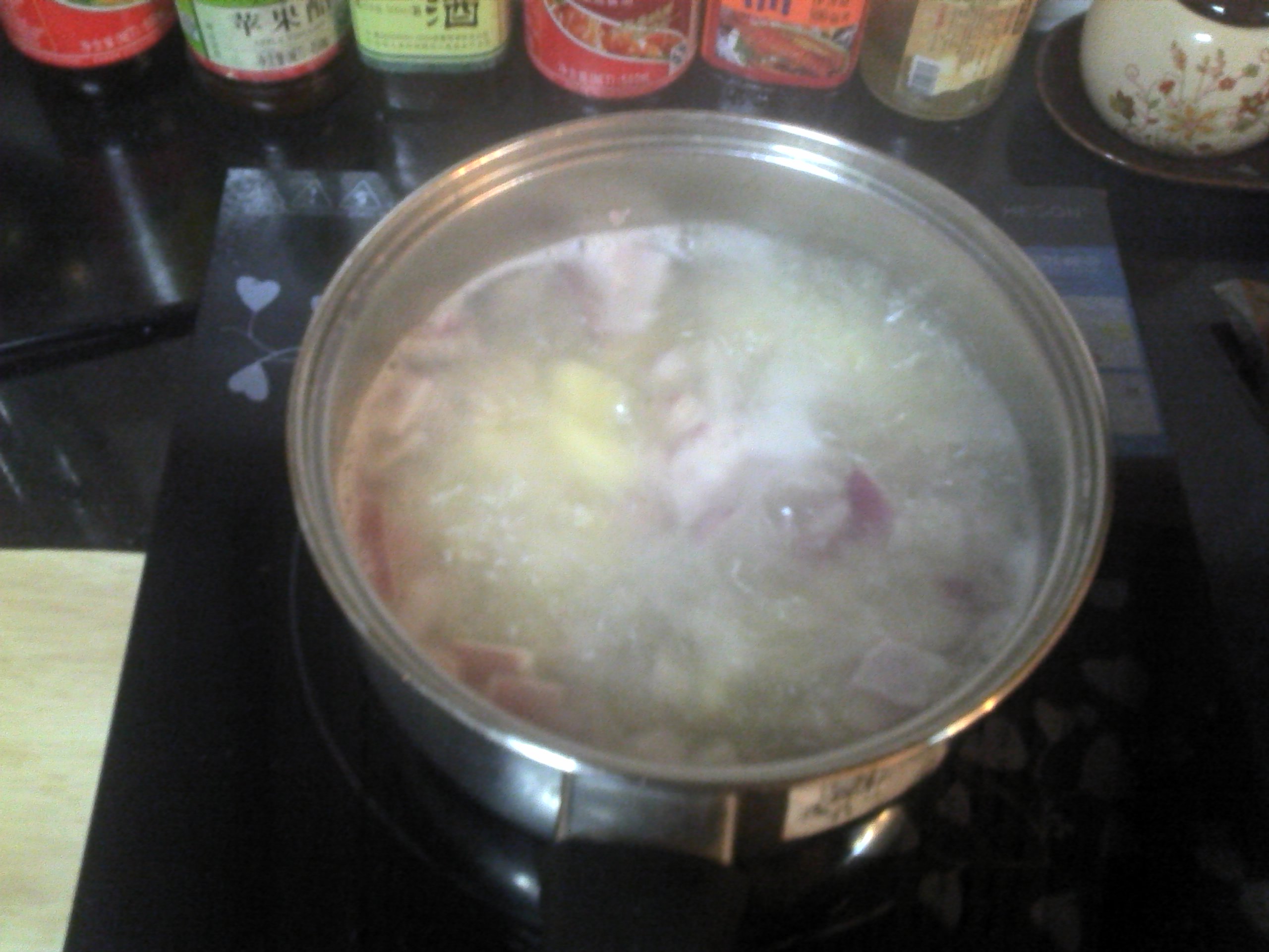把淘米水烧开 放里土豆 洋葱 肉末 咕嘟咕嘟 土豆差不多熟了的时候 再放那些容易熟的青菜,突然间想起来 今天为什么没买点金针磨放里呢 昂~~~~~