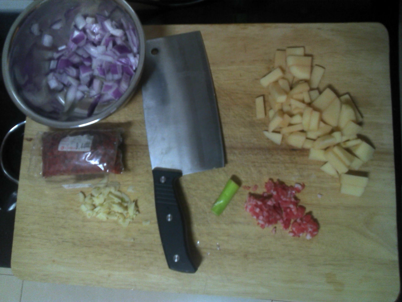 配料今天不全 大概就是土豆丁 肉馅 洋葱 昨天还放的辣椒圈 还可以有豆腐 香菇 豆芽 小白菜 总之 自己喜欢什么就放什么就好啦 哈哈