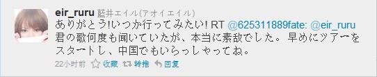 我问:你很喜欢听你的歌,希望以后有机会来中国开演唱会。 艾露回答: 好的 我一定会去的。