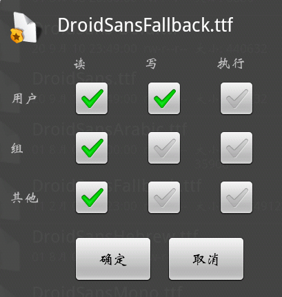 打开re文件管理器,切换左上角挂载只读按钮,将重命名好的字体复制到手机存储/system/fonts/下,覆盖粘贴(可备份原字体,如提示不能粘贴,请切换左上角挂载只读按钮)。长按字体,弹出菜单改好字体文件权限。(如图)