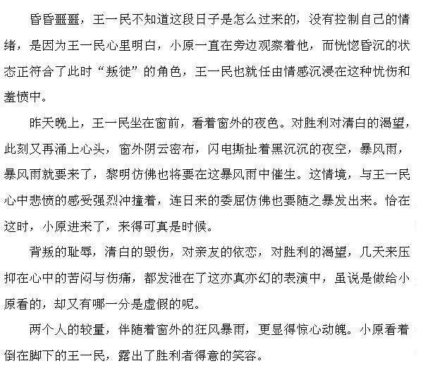 夜幕的王老师圆了陆SG的英雄梦,而风杨笔下的王一民也为我提供了一个圆满心中英雄形象的机会,这段情节只需稍稍改动一下原文中并不重要的情节,就与心中的那个形象契合,只怕笨拙的文笔未必能尽显心中情感。