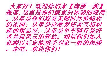 大家好!欢迎你们来【南漂一族】做客,这里是你们疲累后休憩的港湾;这里是你们寂寞无聊时尽情倾诉的家园;这里是诗歌爱好者互相切磋的精品屋;这里是单车骑行爱好者共侃风云的驿站;相信你们加入此群后定能感受到家一般的温暖。来吧,欢迎你们!