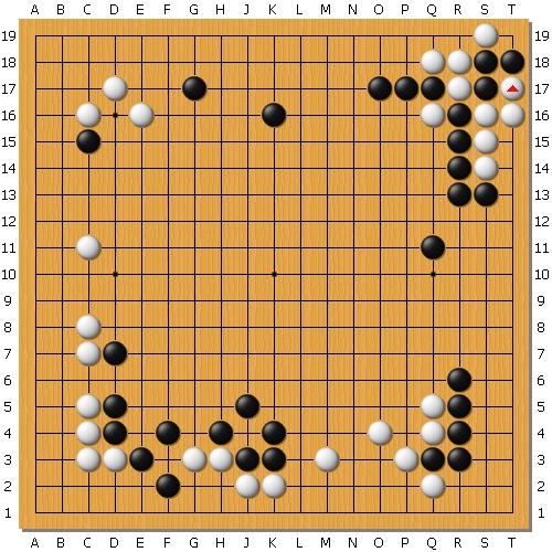 实战白棋在右上活了一块,而黑棋得到了很厚的外势。