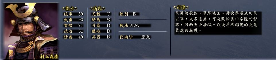 义清的翻身是全面的,能力大幅成长,战法也极度强力。疾驰——骑兵三种特殊战法之一,威力巨大,降低士气,并可能混乱敌军。同样战法的人包含一位偶像男——前田庆次。