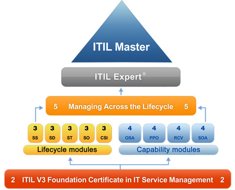 ITIL V3的认证由四个级别构成。它们分别是最下面红色背景的ITIL基础认证(Foundation),中间绿色、灰色和粉红色背景的ITIL中级认证(Intermediate),上面黑色背景的ITIL专家认证(ITIL Expert)和最上面蓝色背景的ITIL大师认证(ITIL Master)。但是,大师级别的认证目前还在开发中,还不可用。ITIL V3认证采用学分制,要拿到ITIL Expert的认证,需要22个学分。(来源:东方瑞通官网)