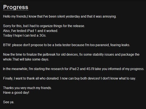Pod2g无疑是现在苹果iOS完美越狱最受瞩目的黑客之一,根据此前他在博客中公开的消息,包括iPhone4、iPod Touch 4、iPod Touch 3、iPhone3GS以及iPad 1代的完美越狱工作已经完成。 Pod2g表示目前的完美越狱仅支持A4芯片设备,但显然他并不满足于此,对于A5芯片的iPhone4S、iPad2他也有意攻破。 之前不少人因为缺少iPad2的破解感到一丝遗憾,这下让我们期待Pod2g取得成功吧。