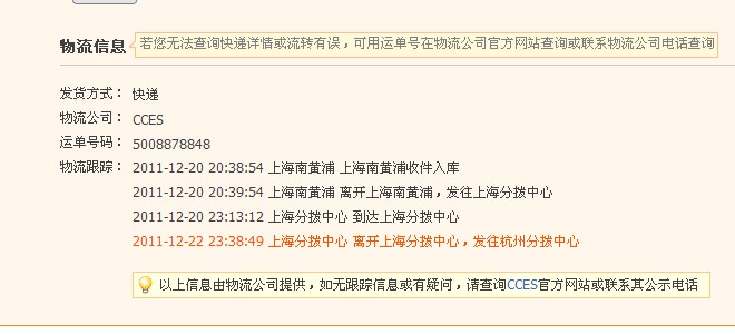 2011-12-22 23:38:49 上海分拨中心 离开上海分拨中心,发往杭州分拨中心
