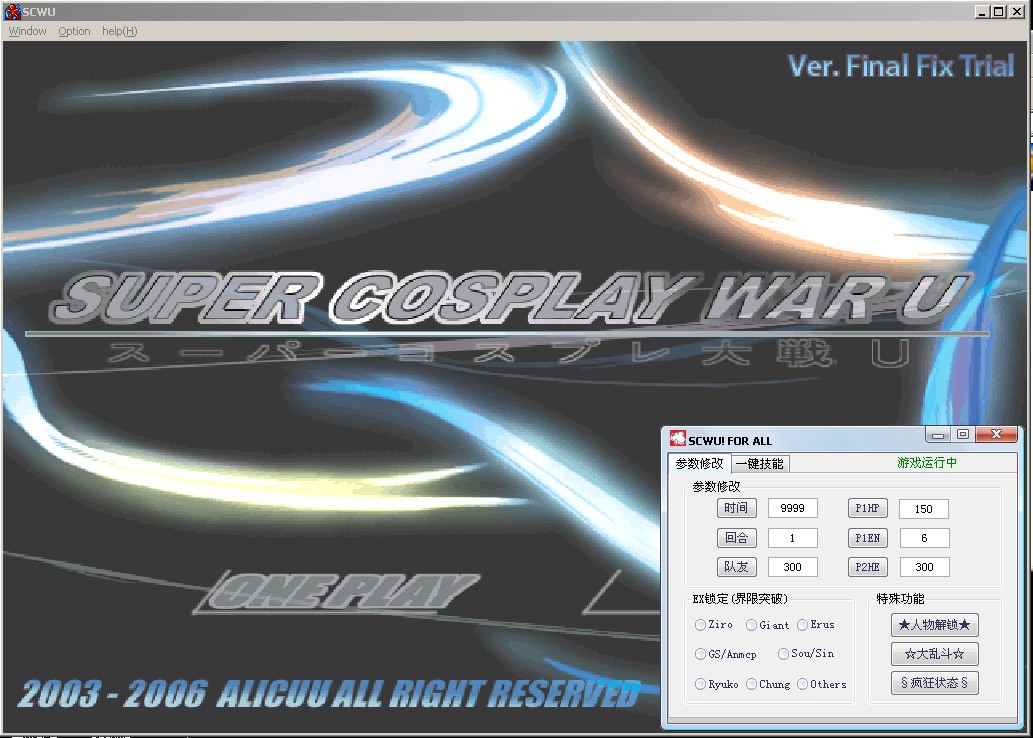 适用版本:SCWU! FOR ALL(SCWU全版本通用修改器) 版本叙述:本程序仅供个人学习交流使用,此版本为在未出新的SCWU版本之前的闭门之作功能:时间锁定、HP锁定、EN锁定、队友HP锁定、回合锁定、EX模式锁定(部分人物)、隐藏人物解锁、大乱斗模式、疯狂状态(人物不会倒地)、一键技能(程如果使用的时候出现延迟或不出技能问题请运行Keyboard修正.reg)
