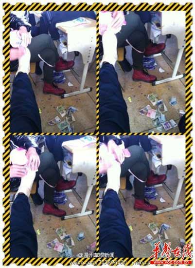 初中女生晒钱擦鞋