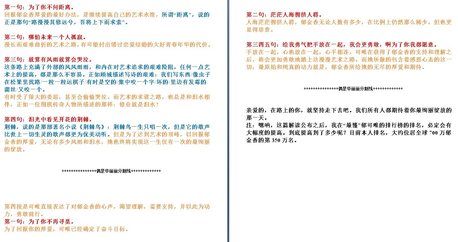 上面红色的部分是沃土歌词的原文。蓝色部分是被引用的一些典故,名著等。黄色的部分是把酒兄所谓的“正确解读”或“真正含义”。纵观全文,这篇大作的格式非常整齐,整齐得像列队的士兵。通过excel,我们可以把其中的内容归纳为这样一个表格。