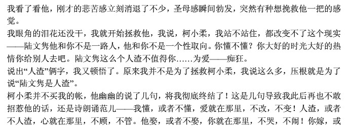 我躲在角落里,笼住衣衫,眼泪朦胧,却又被柯小柔的“舞台剧”般寻死觅活的表演折磨得不知到底该做怎样表情。