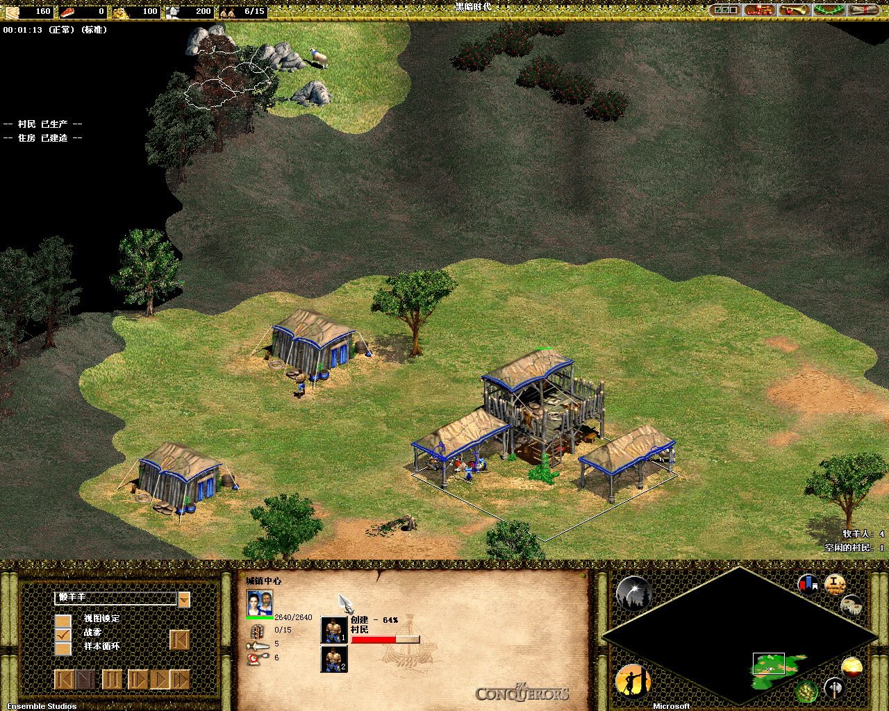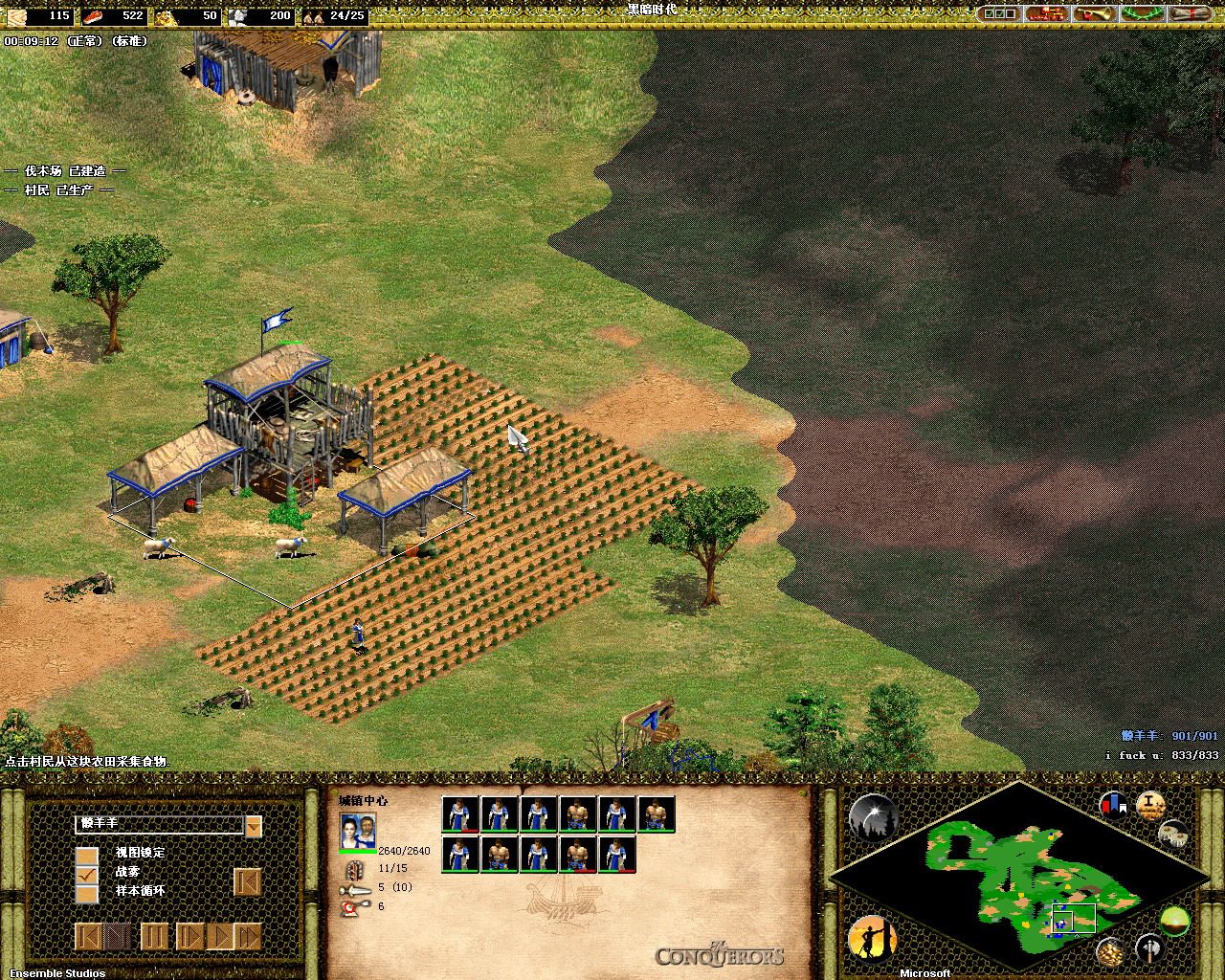 520利用三个房子为自己的伐木场立了一个屏障。。不过事后证明,这个屏障是个败笔,或者说,被520用成了败笔。。。而且这时候已经23p8:50秒了。。。
