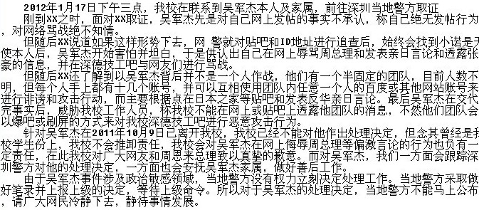 事情源于奇葩的日本之家吧,有个叫“小诺是天使”的ID做了如3L的FS所说的事情,被来自四面八方的人群本,然后恼羞成怒公开了自己的手机号和住址,悲剧的被跨省抓获了,正被拘留,有图有真相有文件,具体可以去参观深德技工学校吧