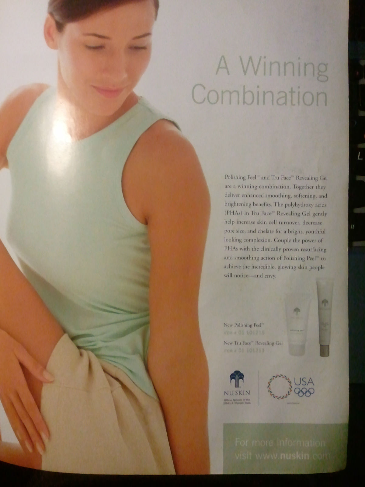 5.2004年雅典夏季奥运会赛事册封三,NUSKIN 和 PHARMANEX 标志在右下角,两款产品广告:微晶焕肤,活颜舒活去皱(摄于原版)