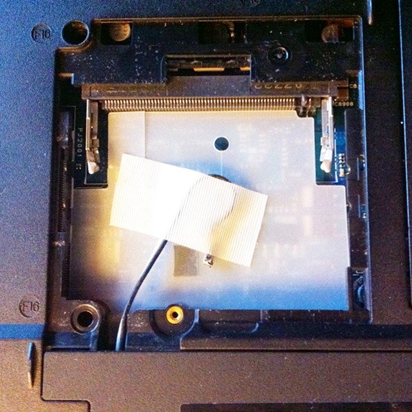 就在电脑背面红圈这个位置,里面有mini PCI槽一个,一根线从机器里面伸出,被胶带粘在那儿,上面还有个小金属头……这个槽就在内存条槽旁边,是啥呢?