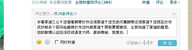 本着厚道之心?您借着韩寒炒作这很厚道?您无故污蔑韩寒这很厚道?您现在炒作没抄够杀个回马枪继续炒作这叫做厚道?那我要感谢您、让我知道了厚道的意思、您的微博认证应该改成语言大师、麦田哦爸、我爱你、