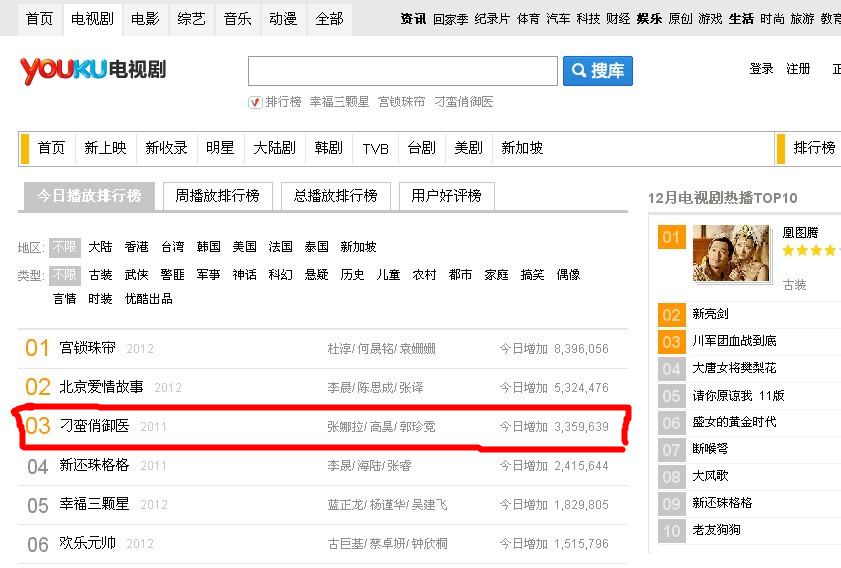 【NARA-0131-高兴】《刁蛮俏御医》今日优酷排名第3,百度排名第5!