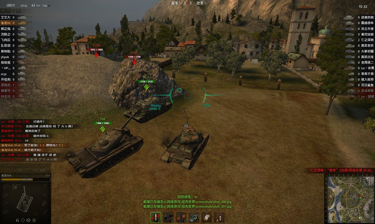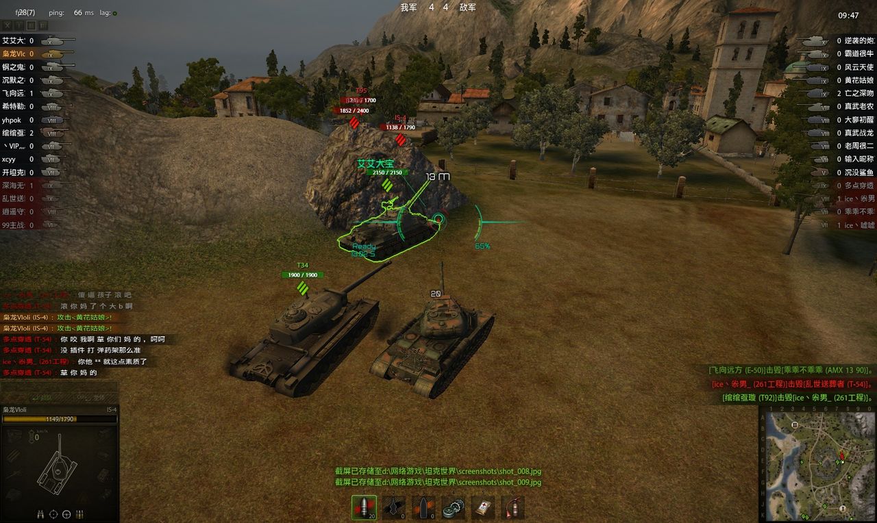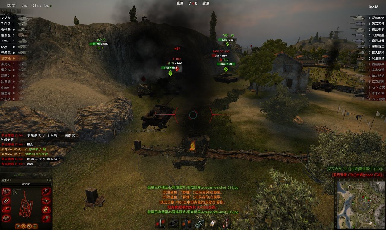 刚刚,玩的湖边图,这奇葩开的54 让我们的-4一炮秒了,,,得嘞!!!这就开始了,骂了整整一场了哦!粗话,脏话,只有你想不到,没有这丫的说不出来滴!咱气不忿就差了丫的战绩,汗!!!!!!!!!!!!!!!!!!!!!!!