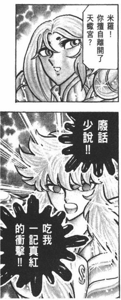 无视於自己小八岁,拒绝於女神,米罗义正严词的给加隆重新再教育(米罗,你怨念很大吗?)