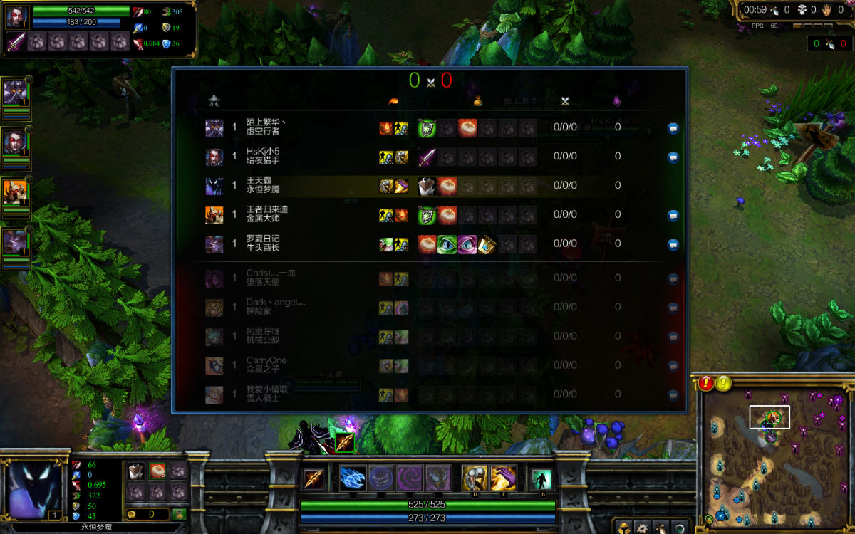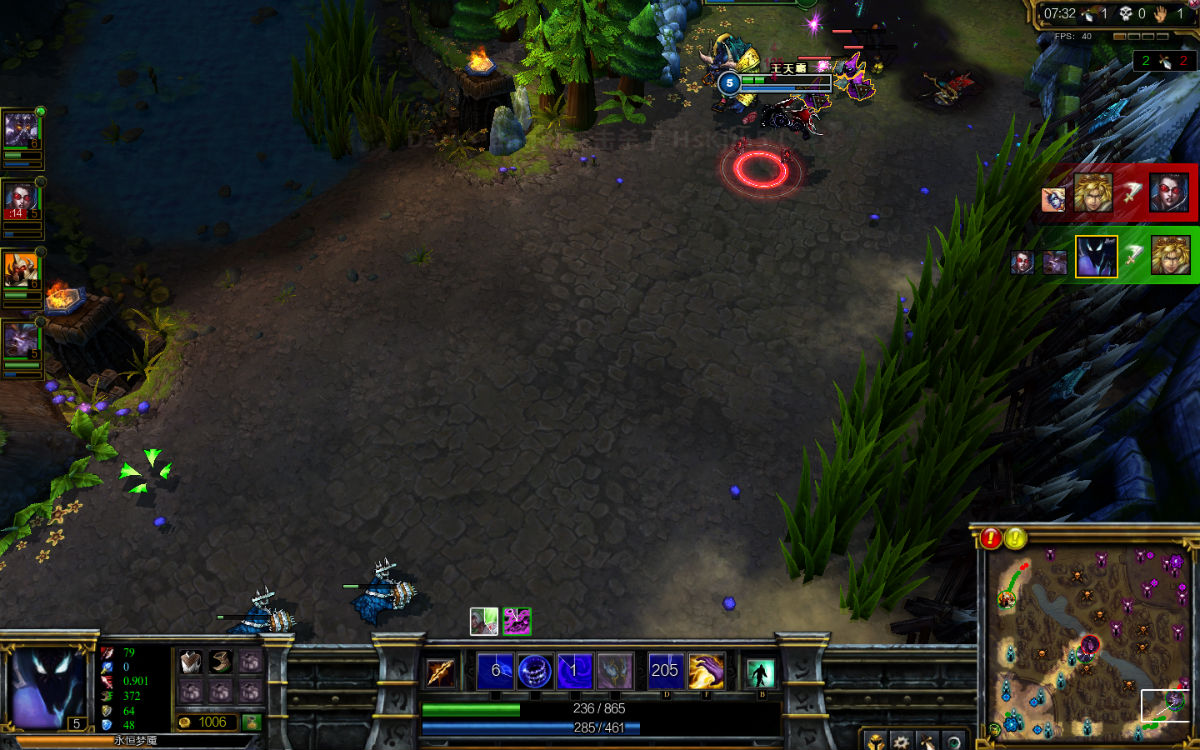 在打了石头人过后~~(上图:对面下路兵线很靠前)我就去GANK一次~我交了虚弱。最后成功~杀1助1~但我们VN也死了。奶大啊!!!