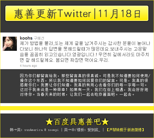 韩翻英: cheerkoo @ soompi KHS =============================== It already smells like spring. I pray that this spring, a jjajjangmyun (noodles with black bean sauce) get-together will definitely occur 已经嗅到春天的气息。我祈祷这个春天一个炸酱面的聚会一定会出现 ============================================================ 不知亲们是否还记闺女曾经发过这样一个推特~~