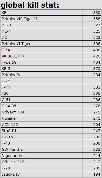 然后,500+以上击杀数量的,依次是虎王,IS3,IS4,IS,虎式。撇开脆脆虎不说,虎王还算中肯,死的多完全是因为德粉太多。。。苏系亲爹,数量多,死的也多,结论还是美系玩家太少了。