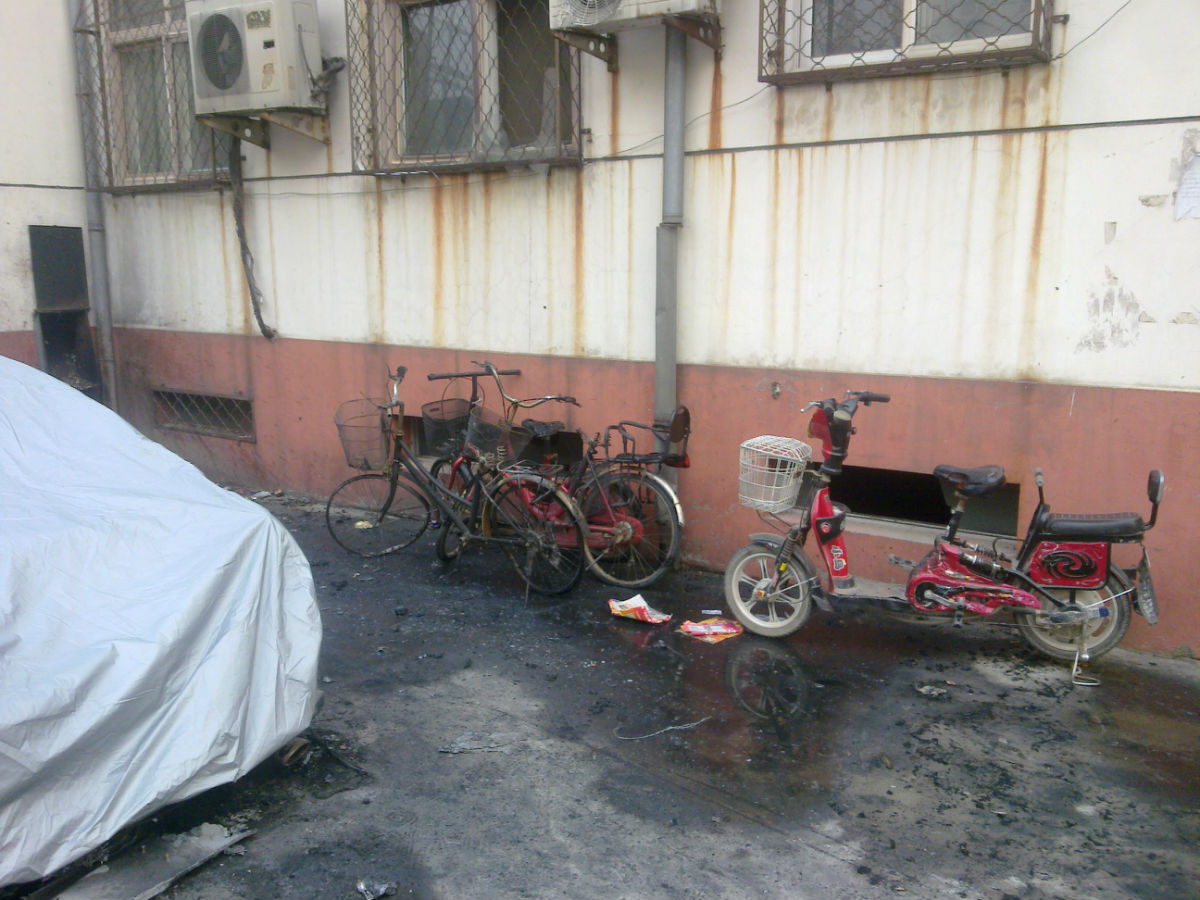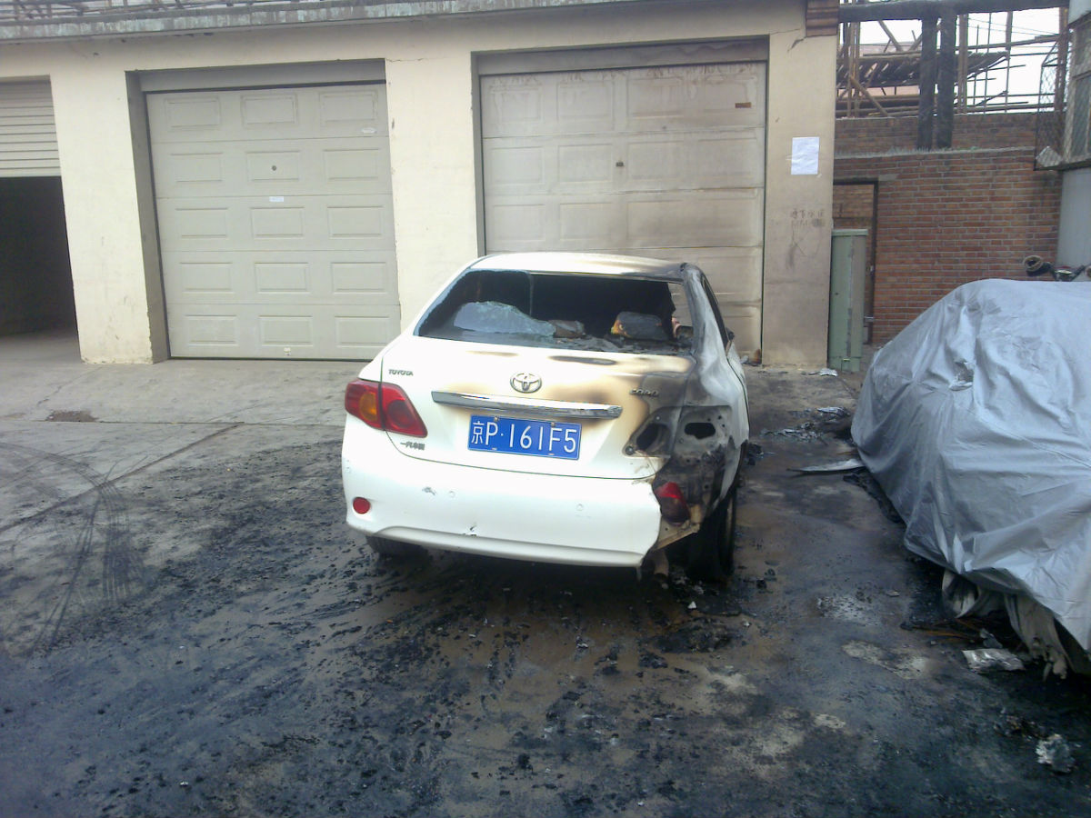 旁边的丰田是受了连累了 盖着那辆基本就烧没了