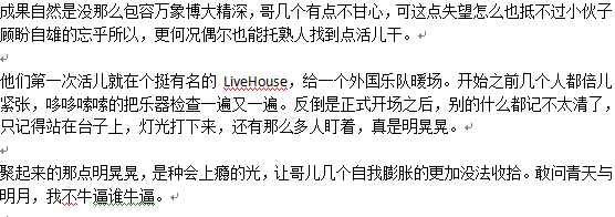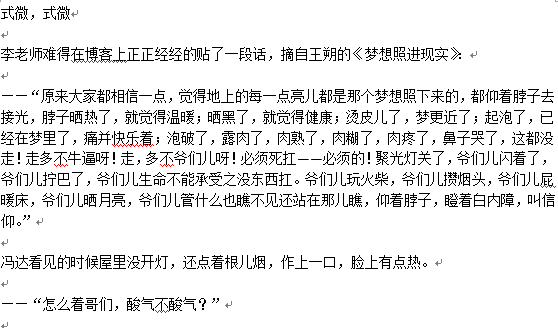 你的结尾“***的酸气”看似很平淡的一句念叨,其实才真正表现了他们当年的热血和青春。你很多文章都是以一句看似没啥特色的句子结了,但是就是有一种摄人心魄的魔力,会自然而然想到自己的日子,自己的选择,把自己当成主角和你文章中的人一起经历那么多的故事。还有小成都,很亲切呀~~~~