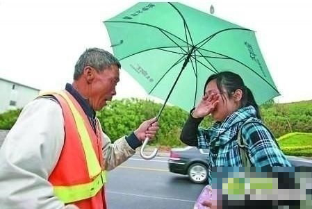 一位环卫工捡到一个女大学生的钱包,在雨中苦等两小时,女大学生赶到后,感动得直掉眼泪。