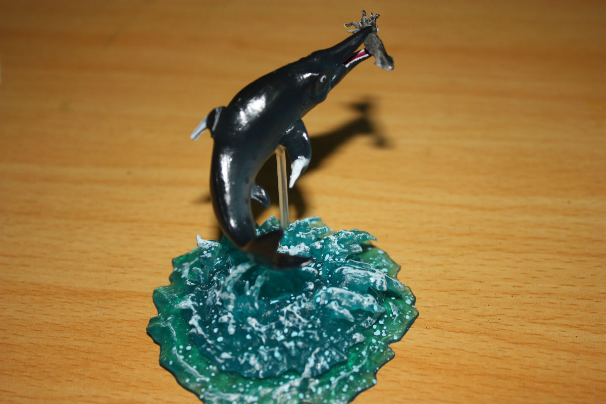 鱼龙捕食场景,做得很有动感,溅起的水花...但是捕食的是一只鱿鱼?鱼龙兄费了这么大的劲跃上水面只为了捕食一只鱿鱼哦..