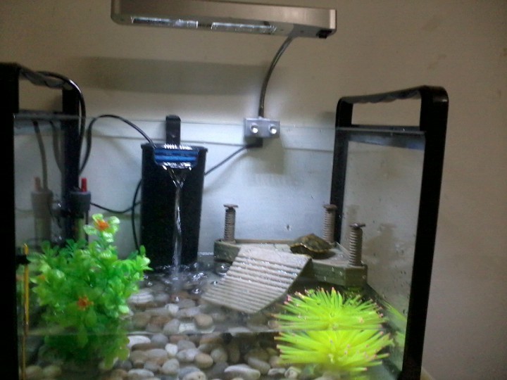 一直都在水里待着,睡觉也是,只是隔一会儿会把头从水里弹出来呼吸一下,就又下去了。我把他们放到晒台上,他们自己很快就钻到水里去了。是不是我的灯有问题?灯是照整个缸的,不是单独照晒台那里,是LED灯,是不会发热的那种白光。