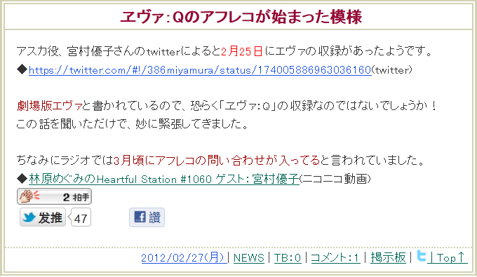 日文blog「min nano EVA-FAN(みんなのエヴァンゲリオンファン)」报道如下: