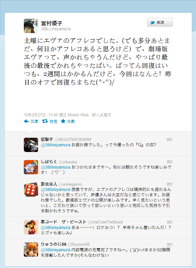 「周六进行了EVA的后期配音活动,(不过可能日后还会不知道哪天有后期配音活动呢),剧场版的配音工作,让我嗓子都哑掉了,最后的最后还是不小心把嗓子弄哑了啊。通常把嗓子养好怎么说都需要两周时间,不过这一次竟然昨天休息了一天嗓子就好啦」