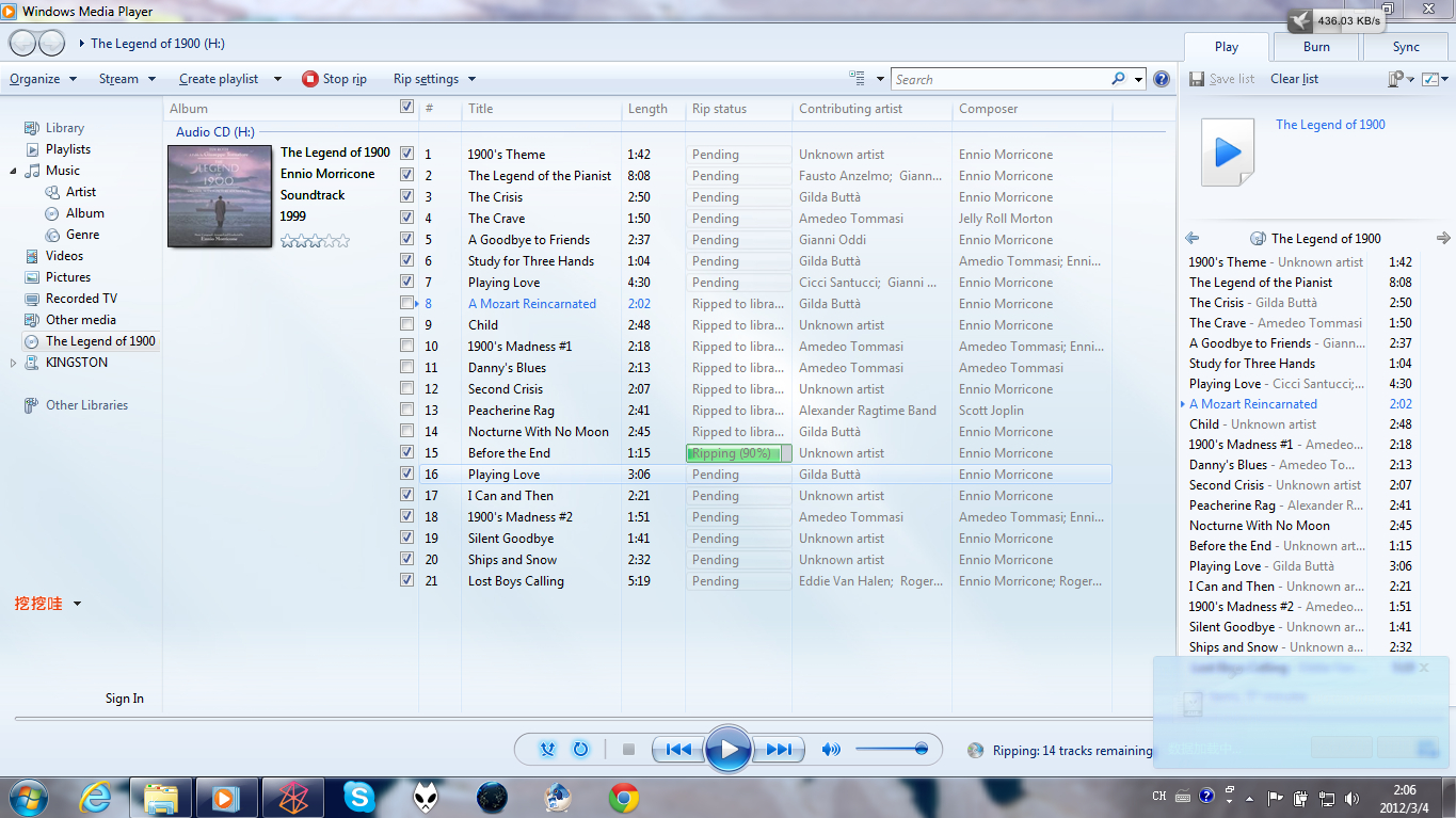如图1所示 WMP里自动显示出虚拟光驱里CD的信息 然后很简单.。。。。。勾选喜欢的音乐 然后在上面选择翻录(rip)就行了