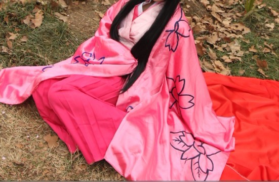 樱姬和服全套【里衣(三层假领)+腰封+裙裤+蝴蝶结+外套(手绘樱花花纹)+2M长拖尾)】=320米