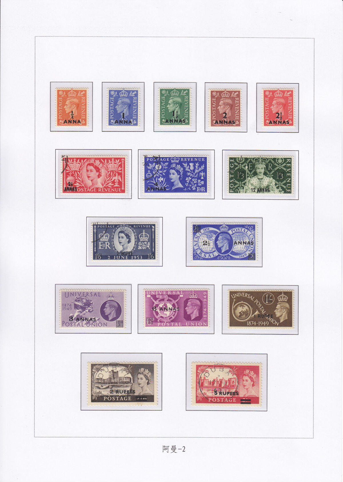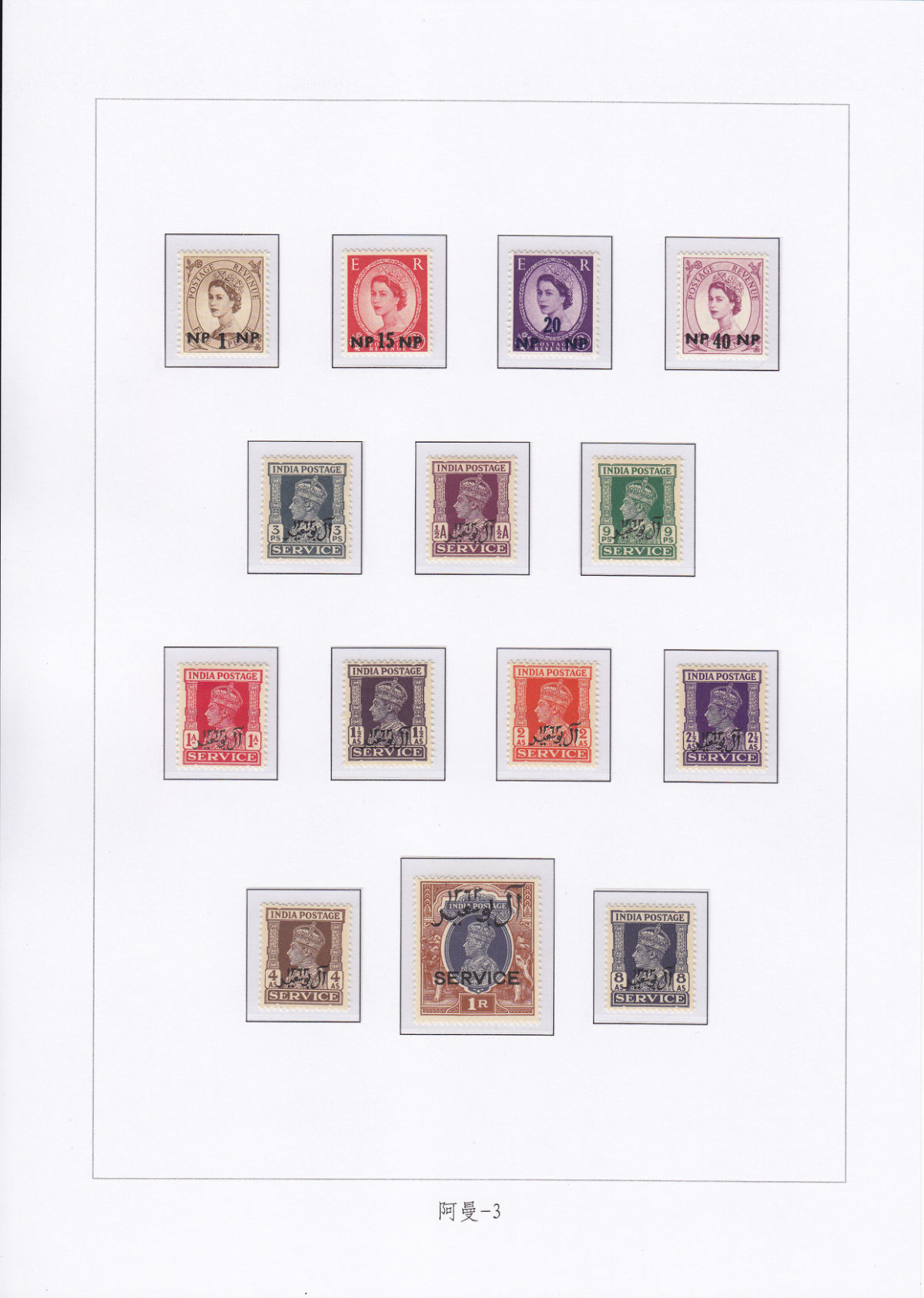 1944年11月20日,英国用印度邮票加盖阿拉伯文“马斯喀特”地名在马斯喀特和附近地区发行。1948年4月至1961年又用英国邮票加盖印度货币名称及免职数字继续发行,这批邮票未加盖地名,除在马斯喀特和附近地区使用外,还在阿拉伯联合酋长国的迪拜、阿布扎比、卡塔尔、巴林和科威特等地使用。1944年11月20日还用印度公事邮票加盖阿拉伯文“马斯喀特”作为公事邮票使用。
