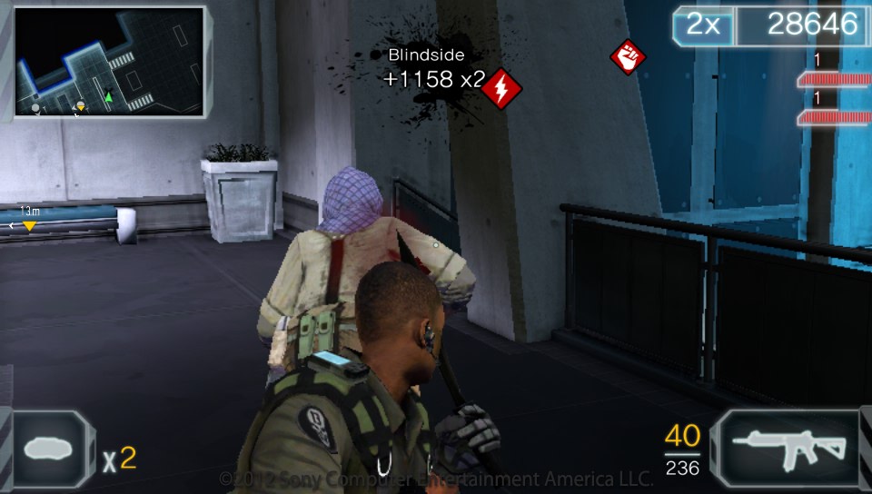 大家应该注意到右上角得分板左边的1X字样了,这里是指目前分数的加成,1X指没加成,2X为2倍得分,以此类推;活的分数加成的方法就是尽量连续得分,右上角偏下那两个红色条就是连续得分条,当短时间做出两次同样的得分是(比如两次近身攻击,两次爆头),就会开始连续得分,这时候红色得分条会慢慢减少,只要在完全减完前再次用同样的方式得分,分数就可以连续获得并得到倍数加成。但注意,不同种类的得分不能连续,比如一次爆头和一次近战是分开计算的,只有多次爆头或多次近战会惊醒连续得分