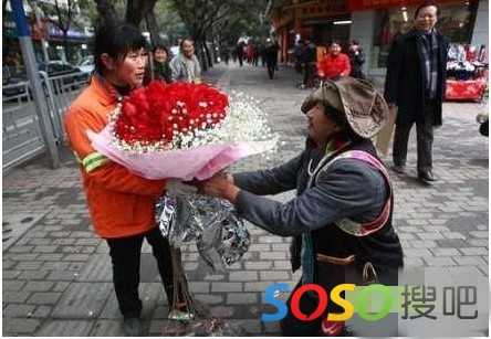 情人节这天,38岁的环卫女工陈国珍像往常一样打扫着重庆的街道。一大束玫瑰突然扑面而来——37岁的羌族男子扎西单膝下跪:嫁给我,好不好?“5.12”地震时扎西左腿骨折,80多斤的陈国珍背着160多斤的他走了两公里。扎西用摆地摊赚的钱买了99朵玫瑰,来向他心目中的女神表白。对于扎西来说,518元这笔开销是个大数目。当记者问扎西,觉不觉得心痛时?扎西露出淳朴的笑容:“心痛,但看到她高兴,我就觉得值!”.