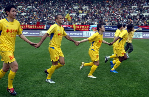 LZ这张照片是和甲A明星队的比赛吧,图的右上面那个穿休闲裤的是个球迷,带个眼镜,他是在11区看的球,比赛完时他从看台上跳下去又从防爆沟里跳上去进入球场的!他一直跟着老全兴的球员想观众致谢!我说的对吗?这场比赛开是前,范大将军和法比来了个大拥抱!