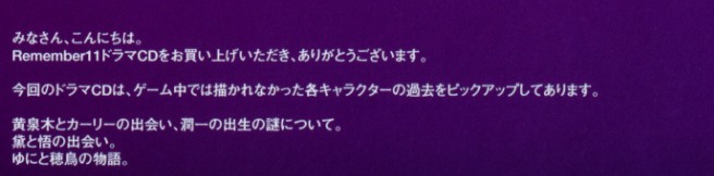 不得不说这回热血了一下,R11这部作品是今年年前接触的,然后到寒假的最后一天才把它通完= =,每次通完这种高热度的游戏,脑子里总是久久不能平复,不过至今只有R11让我热血了那么久知道现在也还是头脑发热,虽然这类游戏接触的不是很多,寒假通完E17之后就预订了R11的初回限定版,因为被某个NC粉推荐说,这游戏买的绝对不亏,不得不说还好买了游戏,现在我比他还狂热于这个拥有无数谜团的世界,R11果然是部让人无法忘记的作品啊...好吧,以上,不说废话了,这次吧里有人翻出了一个压箱底的广播剧,本人虽然日语水平非常渣渣不过还是想为吧里做点贡献,所以这次就搞出了4话的内容(第3话Regret请找高人,我搞不定了...),不过翻到的还是有点难于见人,所以大家只当做参考就好了,翻错的部分我自己掩面...