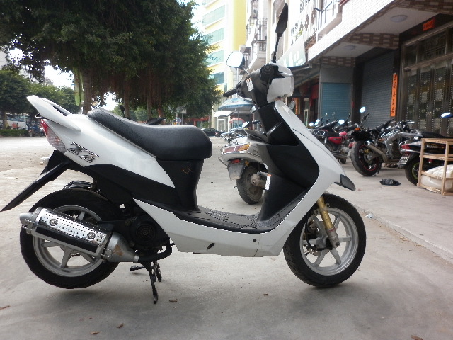 日本铃木50CC踏板车 铃木怪第四代ZZ, 铃木厂家自称是日本50CC中踏板极致最暴力的绵羊,50CC的排量,前后日本原装加高加粗减震,前后轮毂加宽加厚,大车架,离合器是80CC的。踏板中的极品 这车没改装都很暴力 要是这车用来改装肯定好。 不过改装件不太普遍 自己在车行捡了一个日本二手地通拿的前普利盘和普利珠。