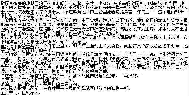 指挥官布莱的晚餐开始于标准时间的三点整,身为一个ARC出身的高级指挥官,他懂得如何利用一切有利的环境补充自己的营养,他将他的经验传授给与他长的一模一样的战友,这些蠢笨如猪的克隆人士兵虽说使唤起来活像个机器人,不过毕竟他们的血管里流着与指挥官一样的血——这个理由对于一个挑剔的杀人专家来说足够了。