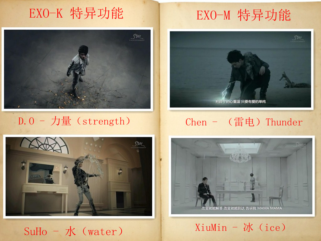看到MAMA 的MV了吧。。大家是否好奇EXO特异功能,本人整理了一下马上上图