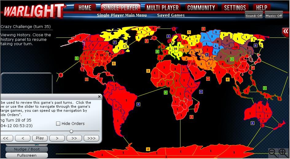 第5回合才占领澳洲非常慢,可以看见几乎所有AI都至少有一块兵源地了,黄色AI已经有两块,后期黄色是我强劲的对手,即使有Save/Load大法,打的还是很艰苦
